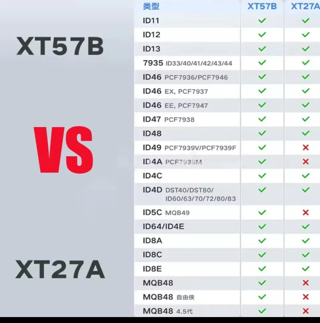 Rendimiento estable: funcionamiento fiable en diversos sistemas inmovilizadores Solución de nivel profesional: esencial para cerrajeros y técnicos automotrices Avances tecnológicos Cobertura mejorada Soporta un 40% más de protocolos en comparación con el XT27A anterior Integración perfecta Funciona con las herramientas de diagnóstico de VVDI para: Generación y clonación de chips Coincidencia de transpondedores Programación llave Compatible con los principales dispositivos de programación de inmovilizadores Eficiencia optimizada Reduce los costos de inventario (1 chip, múltiples aplicaciones) Reduce el tiempo de coincidencia de llaves en un 60%